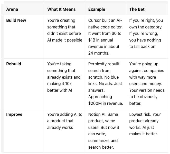 The mistake is playing the wrong one. If you’re adding AI to an existing product but acting like you’re building a new category, you’ll spend too much money and confuse your users. If you’re trying to create a new category but playing it safe, someone bolder will beat you.