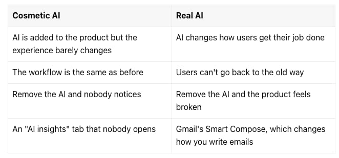 Here’s a simple test. Take the AI feature out of your product tomorrow. Is the product meaningfully worse? If users wouldn’t even notice, you’ve built something cosmetic.