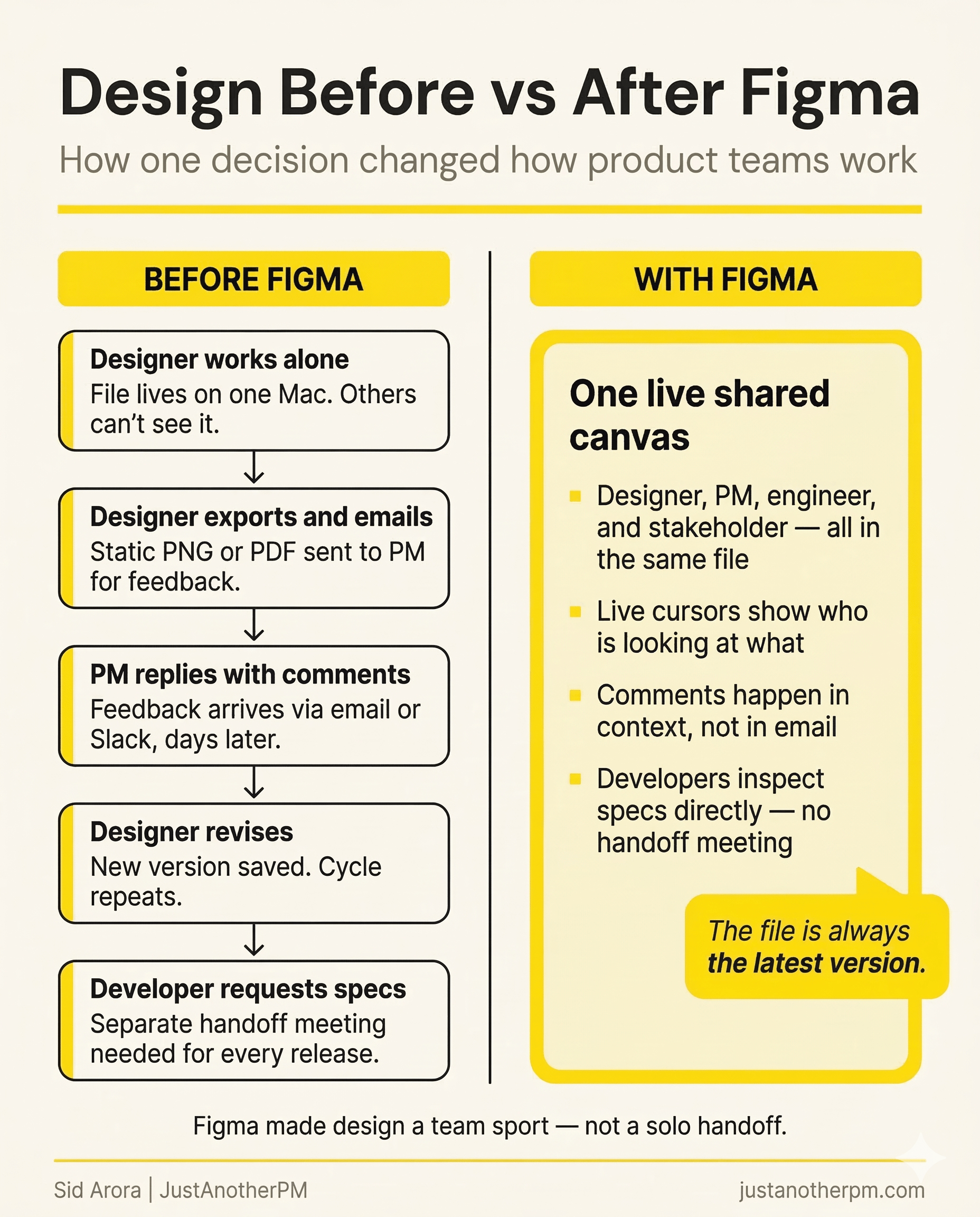 Before Figma, design files lived on one person's laptop. The designer was the gatekeeper. A PM who wanted to check the latest mockup had to ask.