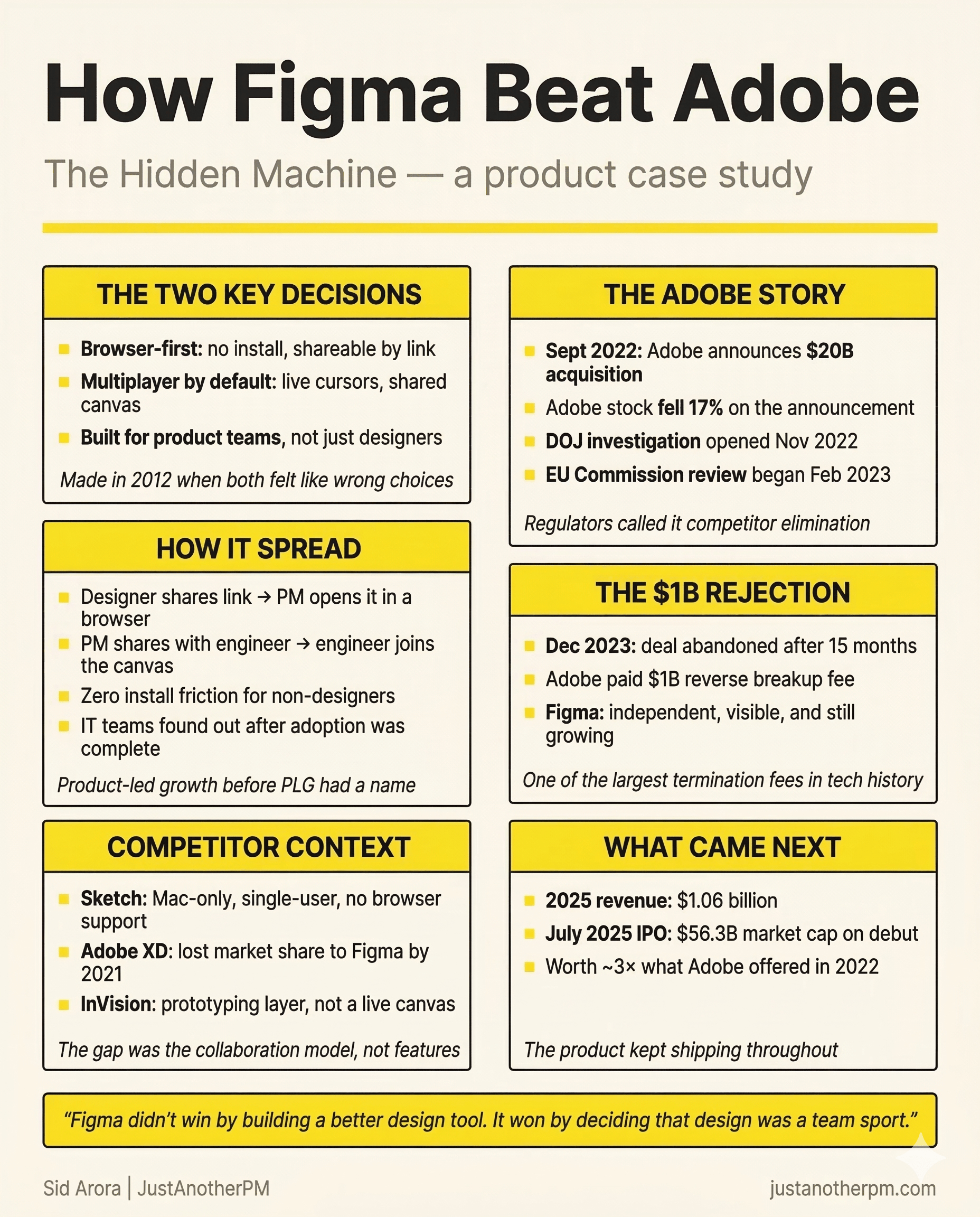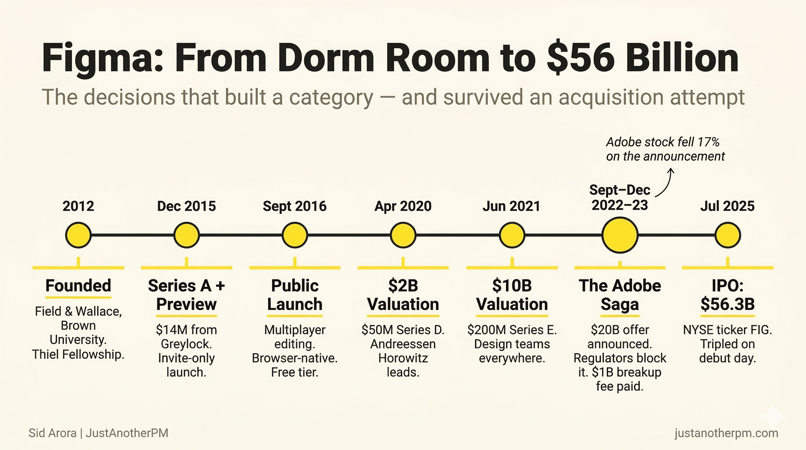 What happened next is the story of how one product decision built a $10 billion company, attracted a $20 billion acquisition offer from Adobe, and made Figma so valuable that Adobe's own shareholders punished the company just for trying to buy it.