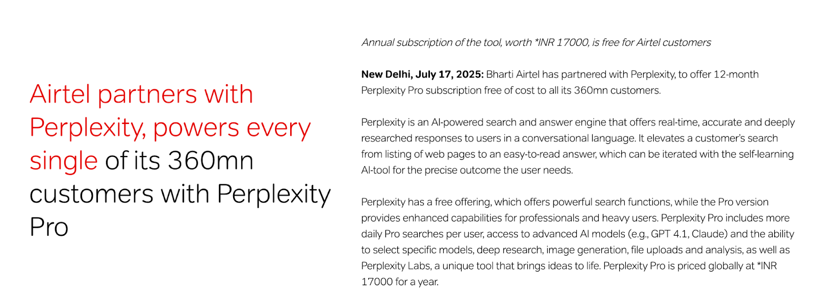 Perplexity had already partnered with India's Paytm earlier in 2025 and has signed partnerships with over 25 telecom firms globally, including SoftBank in Japan, SK Telecom in South Korea, and T-Mobile in the US.