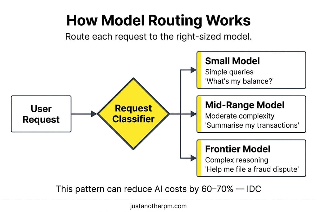 A simple query ("What's my account balance?") goes to a small model. Fast. Cheap. Done.