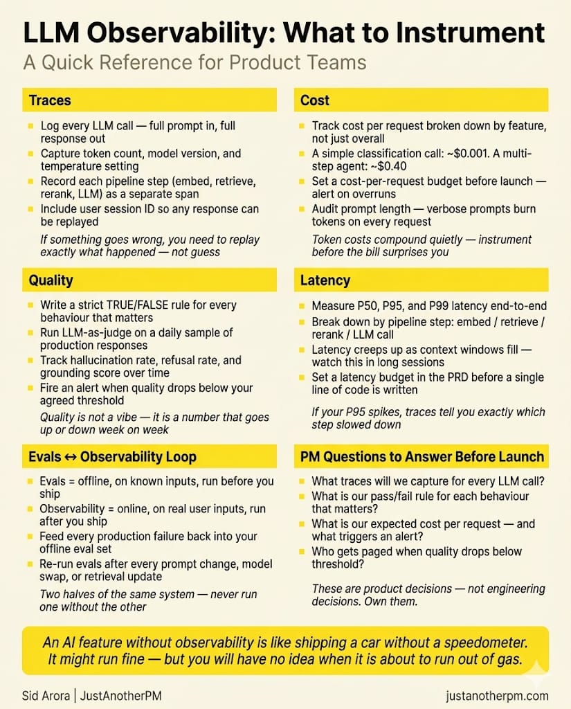The eval set you built before launch becomes your baseline. Observability tells you whether production is holding to that baseline — or drifting from it.