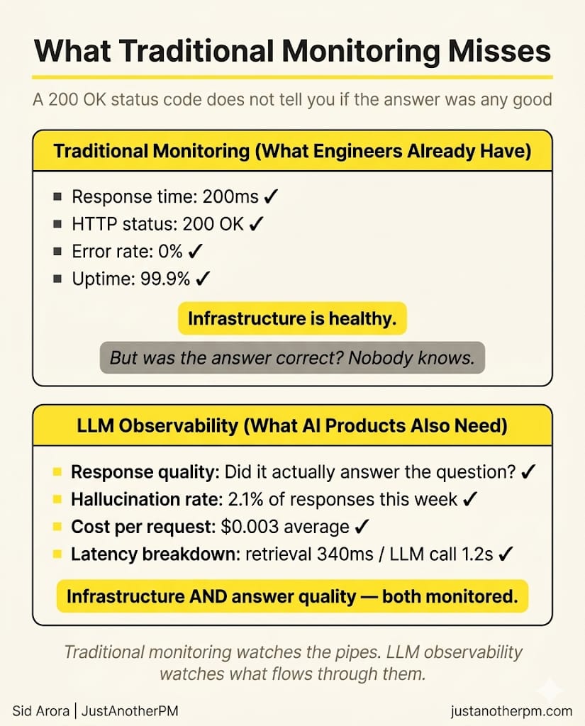 LLM observability covers three things that traditional monitoring does not touch.
