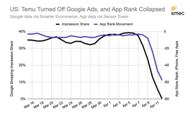 Temu's App Store ranking collapsed from #3 to #85 in two weeks after tariff changes. (Source)